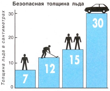 v Переходить водоемы по льду можно, когда его толщина достигает 5-7 см, а группа людей — 7-12 см.